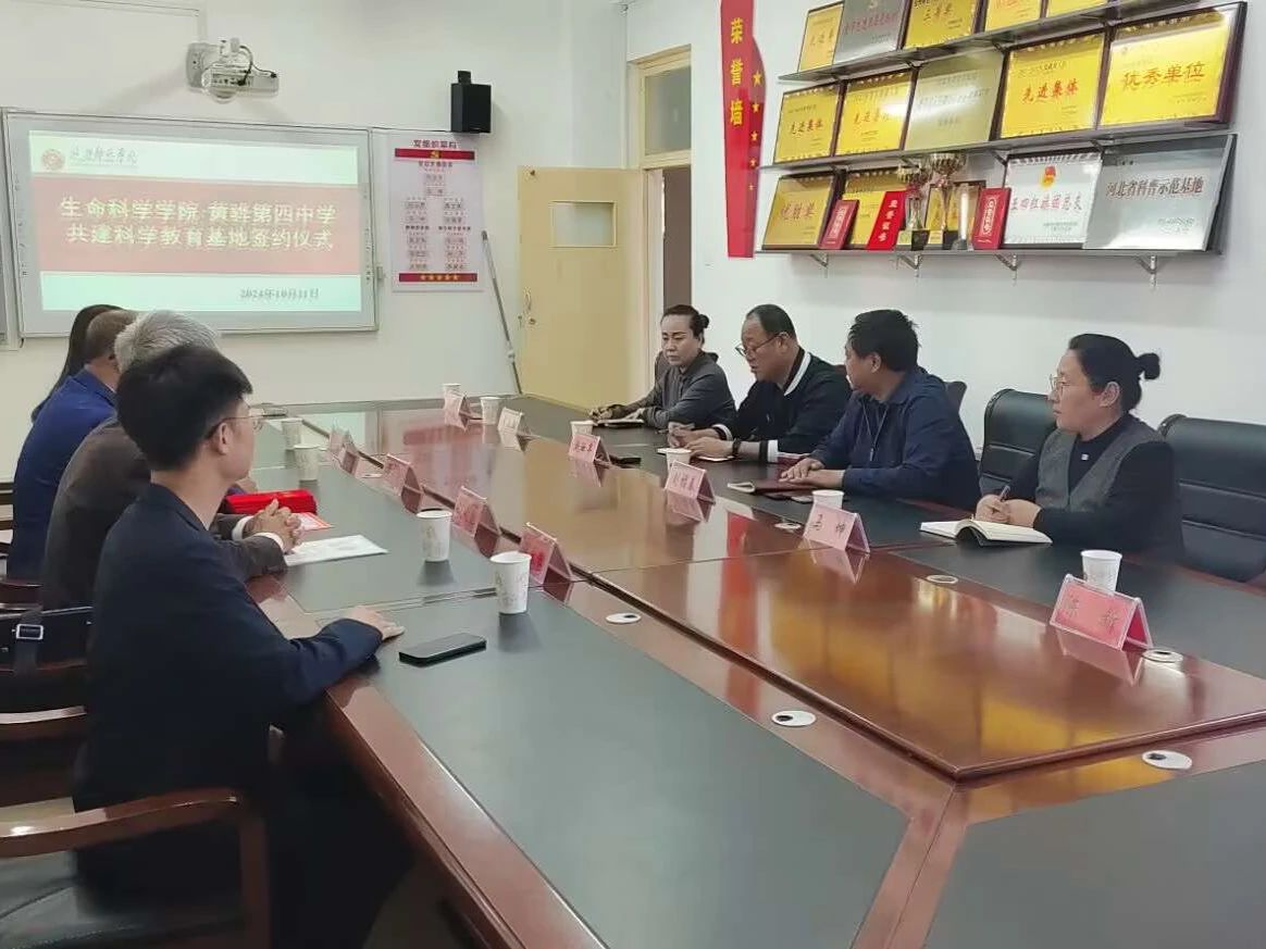 為深化科教融合,激發(fā)學(xué)生科研興趣,共同培養(yǎng)未來科學(xué)人才,搭建高校與中學(xué)合作橋梁,2024年10月11日,生命科學(xué)學(xué)院與黃驊市第四中學(xué)共建科學(xué)教育基地簽約儀式于鯤鵬樓四樓會議室正式舉行。