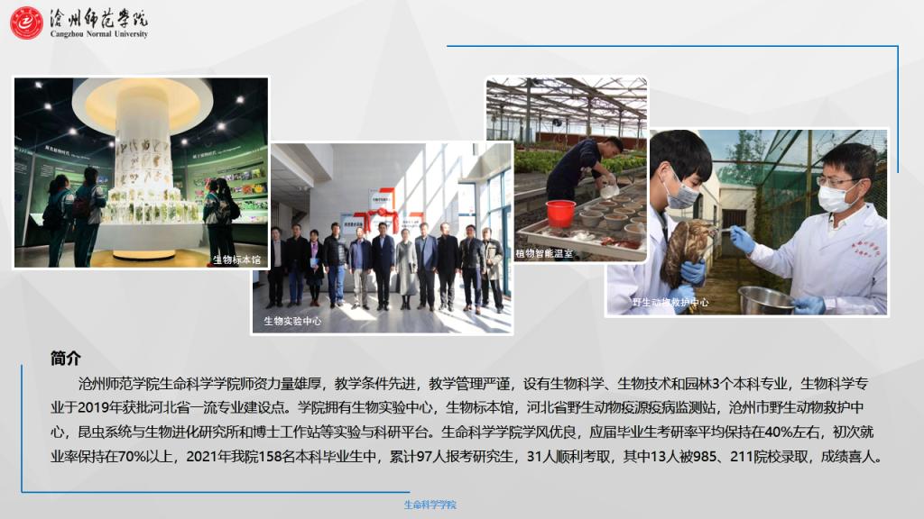 滄州師范學院生命科學學院師資力量雄厚,教學條件先進,教學管理嚴謹,設有生物科學、生物技術(shù)和園林3個本科專業(yè),生物科學專業(yè)于2019年獲批河北省一流專業(yè)建設點。學院擁有生物實驗中心,生物標本館,河北省野生動物疫源疫病監(jiān)測站,滄州市野生動物救護中心,昆蟲系統(tǒng)與生物進化研究所和博士工作站等實驗與科研平臺。生命科學學院學風優(yōu)良,應屆畢業(yè)生考研率平均保持在40%左右,初次就業(yè)率保持在70%以上,2021年我院158名本科畢業(yè)生中,累計97人報考研究生,31人順利考取,其中13人被985、211院校錄取,成績喜人。