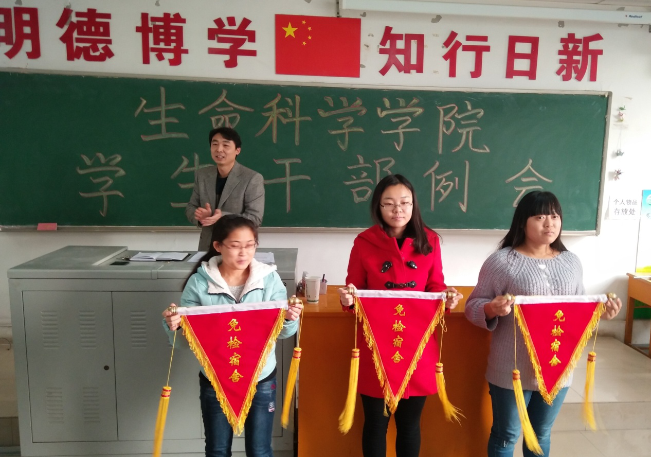 (新聞中心訊)為迎接2017年教育部本科教學(xué)工作合格評估,進一步提升我院學(xué)生的整體素質(zhì),樹立優(yōu)秀學(xué)生榜樣,2016年11月7日中午12:30,我學(xué)院在理科樓11階梯教室召開生命科學(xué)學(xué)院學(xué)生干部例會,楊勇副書記、輔導(dǎo)員葉燕老師、團總支學(xué)生會全體成員以及各班學(xué)生干部參加了此次例會。會議中,楊書記對我學(xué)院考勤與衛(wèi)生方面表現(xiàn)尤為突出的同學(xué)提出了表揚,并頒發(fā)了流動紅旗,要求同學(xué)們以他們?yōu)榘駱?/font>,在今后的學(xué)習(xí)工作中創(chuàng)造出更好的成績。