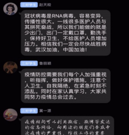 此次云端主題團課,各班團支書充分利用QQ群、微信群等,通過PPT、防疫小視頻及同學們互相討論的形式展開。團課圍繞“宣傳防疫知識、致敬抗疫英雄、分享假期成長感悟”三點展開,各班團支書結合生物專業(yè)知識,將與新型冠狀病毒相關的科普知識進行了全面的講解,分享了疫情的最新動態(tài),同時,通過視頻的形式,向同學們展現了奮戰(zhàn)在抗疫一線的醫(yī)務人員的英勇和擔當,同學們也紛紛表達了對一線工作者的贊賞與敬佩。