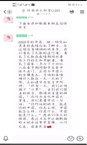 18級生物技術(shù)班王鳳圓表示:因為疫情,我們進(jìn)行了一場特殊的升旗儀式,當(dāng)聽到國歌響起,我熱血沸騰,想到那些戰(zhàn)斗在一線的人民子弟兵,想到那些浴血奮戰(zhàn)的醫(yī)護(hù)人員,此刻,我比任何時候都渴望面向國旗,大聲唱國歌、敬隊禮、行注目禮!什么都不能壓垮我們中華民族不屈的脊梁,華夏兒女永遠(yuǎn)不會被打垮,因為我們熱愛我們的祖國,熱愛祖國的每一片土地,全國人民萬眾一心,疫情終將煙消云散。生于中國,何其有幸!